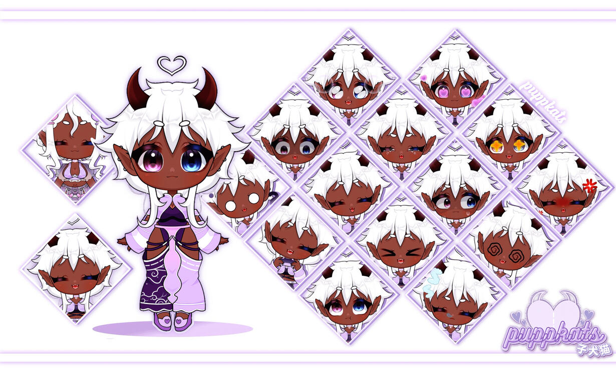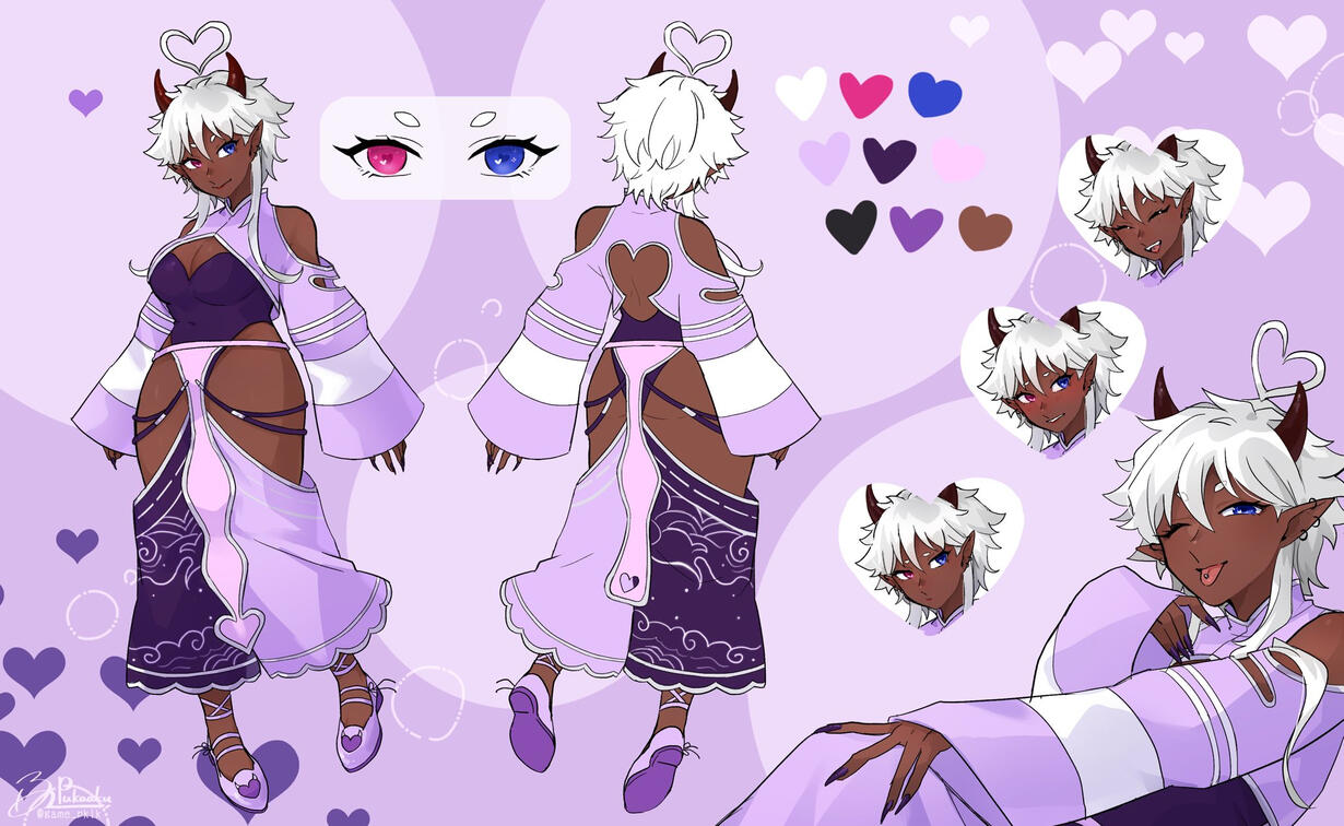 | Other | ✦ They have deep red-brown horns and a heart ahoge that floats above their head. ✦ They have a womb tattoo in the shape of a heart shown in different outfits. |